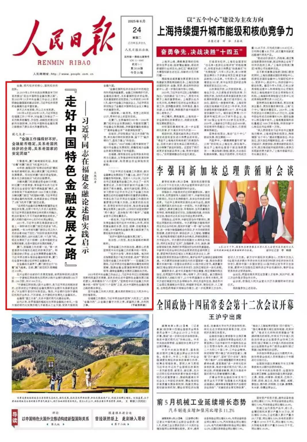 連日來,人民日報、新華社、中央廣播電視總臺、經(jīng)濟日報等中央主要媒體在重要版面、主要新聞節(jié)目,集中報道習近平同志在福建工作期間的金融論述與實踐啟示,系統(tǒng)分析中國特色金融發(fā)展之路的理論淵源與鮮明特點,揭示其為全球金融發(fā)展和治理貢獻的中國方案與中國智慧。一起來學習各家央媒的報道—— 人民日報 6月24日,《人民日報》頭版頭條刊發(fā)《“走好中國特色金融發(fā)展之路”——習近平同志在福建金融論述和實踐啟示》。