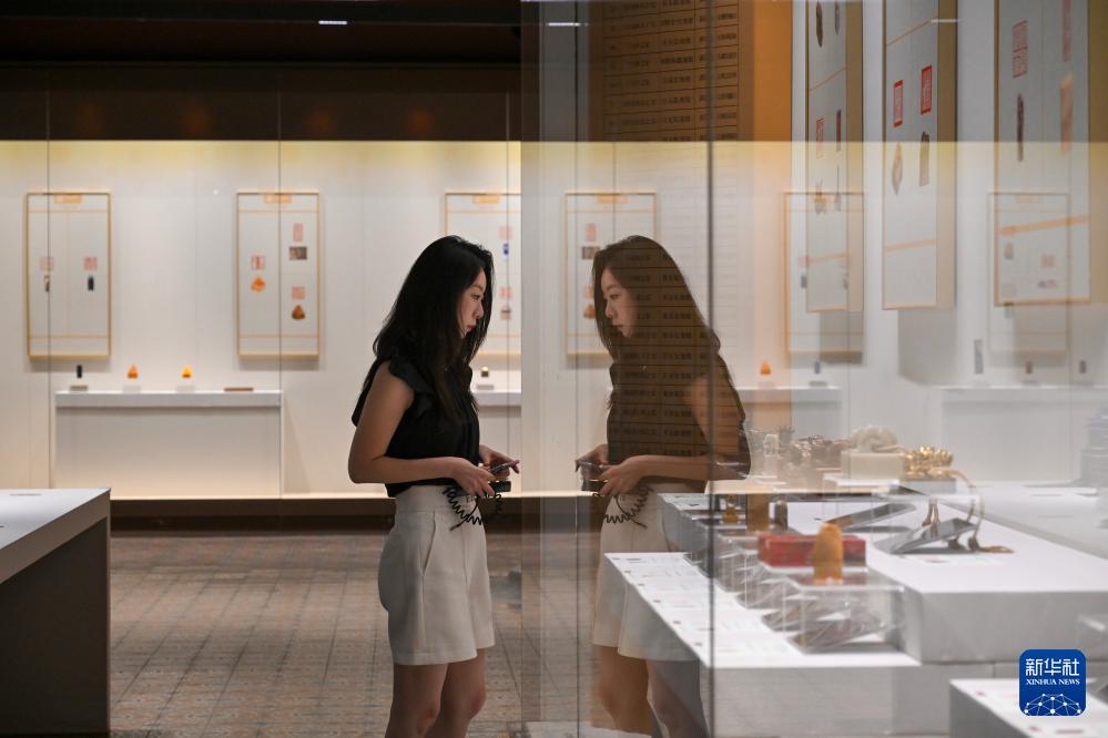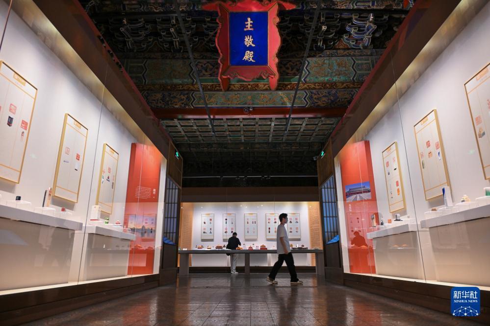 7月27日,觀眾在故宮文華殿欣賞篆刻作品展。 當(dāng)日,由故宮博物院、北京京企中軸線保護(hù)公益基金會共同主辦,北京歌華文化中心有限公司承辦的“世界文化遺產(chǎn)北京中軸線——印記北京中軸線大眾篆刻作品展故宮站”在北京故宮博物院文華殿開幕。 展覽分為“大眾篆刻·中軸新章:人民筆下的中軸線”“故宮璽印·紫禁回響:宮廷印章中的歷史密碼”兩大板塊,主要展出200枚大眾篆刻作品與20方清代宮廷璽印。 新華社記者 金良快 攝