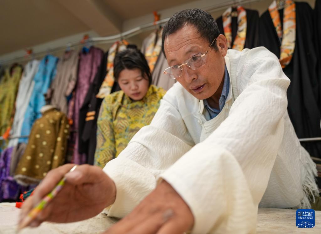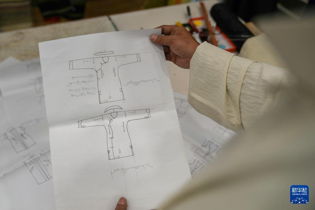 洛桑麥朗手繪的藏裝制作要領(8月15日攝)。 在拉薩雪堆白傳統手工藝術學校,60歲的西藏自治區級非物質文化遺產項目藏族服飾(拉薩服飾)代表性傳承人洛桑麥朗,與學徒一道研究、制作藏裝。從藝四十余載,他培養了百余名弟子,還參與編撰教材、建立藏族服飾數據庫等工作。在他的巧手下,新式藏裝將傳統與現代交融,讓非遺技藝與現代審美碰撞,成為街頭一道靚麗的風景。 新華社記者 晉美多吉 攝