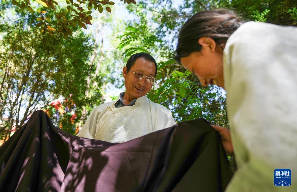 洛桑麥朗在檢查做好的藏裝(8月15日攝)。 在拉薩雪堆白傳統手工藝術學校,60歲的西藏自治區級非物質文化遺產項目藏族服飾(拉薩服飾)代表性傳承人洛桑麥朗,與學徒一道研究、制作藏裝。從藝四十余載,他培養了百余名弟子,還參與編撰教材、建立藏族服飾數據庫等工作。在他的巧手下,新式藏裝將傳統與現代交融,讓非遺技藝與現代審美碰撞,成為街頭一道靚麗的風景。 新華社記者 晉美多吉 攝