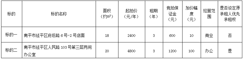 受委托,定于2025年9月2日上午9:00,通過延平區陽光平臺(http://ypygpt.zgpm.com/)舉行公開網絡競拍: 一、競拍標的:南平市延平區府后路、人民路辦公室(店面)三年期租賃權,具體標的詳情如下: 南平市延平區府后路、人民路辦公室(店面)三年期租賃權一覽表