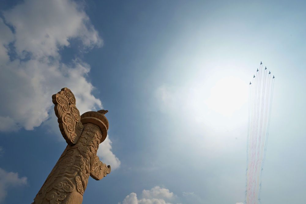 9月3日,紀念中國人民抗日戰爭暨世界反法西斯戰爭勝利80周年大會在北京隆重舉行。這是空中護旗梯隊接受檢閱。新華社記者 王婧嬙 攝 9時44分,閱兵分列式開始—— 請檢閱!空中護旗梯隊鐵翼飛旋,儀仗方隊闊步走來,黨旗、國旗、軍旗在萬眾矚目中迎風向前;戰旗方隊氣勢如虹,官兵們守護著熊熊火炬般的旗陣浩蕩而來……鮮紅奪目的忠誠底色,彰顯政治建軍新風貌。 請檢閱!4個軍種方隊、4個兵種方隊,武警部隊方隊、預備役部隊方隊、民兵方隊,步伐堅實有力,氣勢排山倒海……闊步向前的強大方陣,體現力量結構新布局。 請檢閱!地面裝備引擎轟鳴,海空戰機振翅長空,匯成澎湃的鐵流、呼嘯的鷹陣,受閱裝備都是國產現役主戰裝備、多數為首次亮相……制勝未來的打贏利器,展示現代化建設新進展。 請檢閱!陸上作戰、海上作戰、防空反導等7個作戰群按照實戰化聯合編組,預警偵察、遠程打擊、制空作戰等機型成體系編隊展示,各方向各領域軍兵種力量深度耦合、渾然一體……現代戰爭多維力量的綜合運用,凸顯備戰打仗新成效。 寬闊的長安街向遠處延伸,以“復興”命名的道路平直如砥。受閱官兵昂首挺胸、步履鏗鏘,向著強國強軍的光明前景前進。