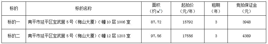 受委托,定于2025年10月9日上午9:00,通過延平區陽光平臺(http://ypygpt.zgpm.com/)舉行公開網絡競拍: 一、競拍標的:南平市延平區寶武營5號(梅山大廈)C幢房屋三年期租賃權,具體標的詳情如下: 南平市延平區寶武營5號(梅山大廈)C幢房屋三年期租賃權一覽表