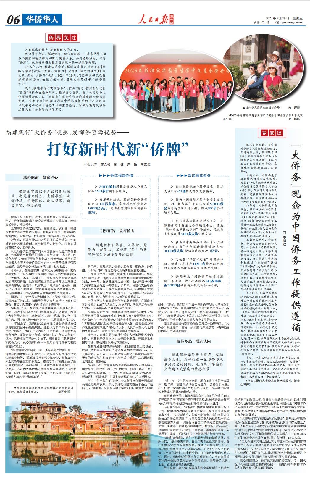 9月26日,人民日報海外版華僑華人版整版報道點贊福建僑務工作!頭條刊登《福建踐行“大僑務”觀念、發揮僑資源優勢——打好新時代新“僑牌”》通訊,聚焦福建省深入貫徹落實“大僑務”觀念、打好新時代新“僑牌”座談會精神,借助僑力、打好“僑牌”;“專家談”欄目刊發《“大僑務”觀念為中國僑務工作提供遵循》。