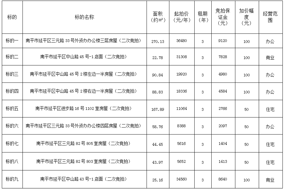 受委托,定于2025年10月17日上午9:00,通過延平區(qū)陽光平臺(http://ypygpt.zgpm.com/)舉行公開網(wǎng)絡(luò)競拍: 一、競拍標的:南平市延平區(qū)三元路、中山路、進步路房屋(店面)三年期租賃權(quán)(二次競拍),具體標的詳情如下: 南平市延平區(qū)三元路、中山路、進步路房屋(店面)三年期租賃權(quán)(二次競拍)一覽表