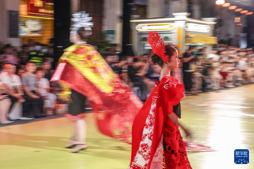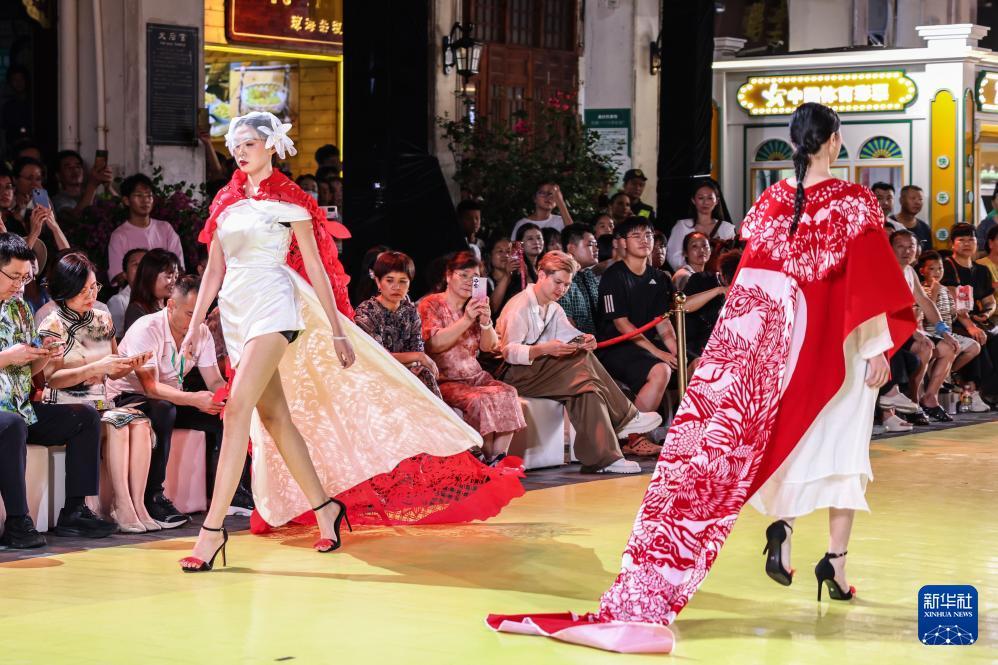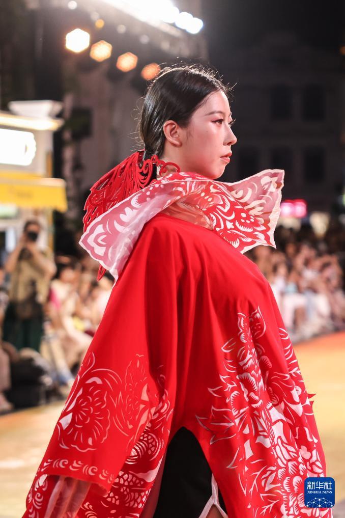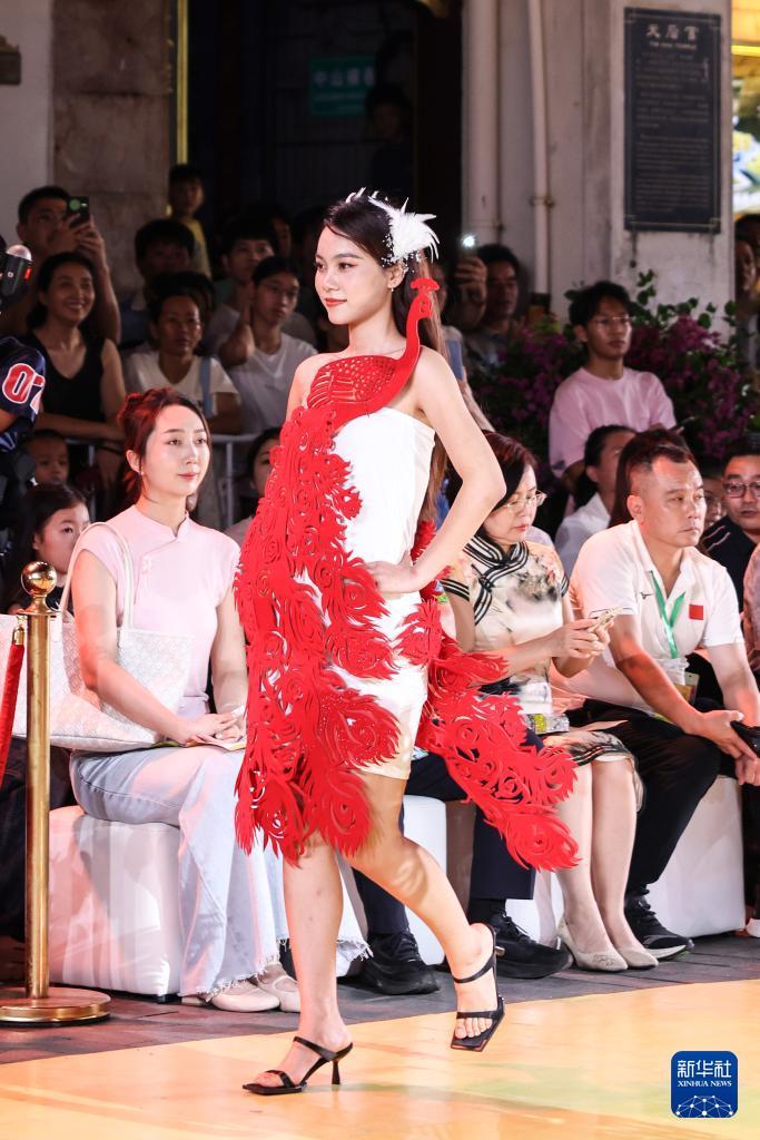 10月7日,身穿剪紙主題時裝的模特在海口騎樓老街走秀。 10月7日晚,作為2025??谒囆g周系列活動之一,錦色·2025非遺潮秀在??隍T樓老街啟幕?;顒右裕⒎沁z再創"為核心,將剪紙藝術元素融入時裝走秀。 新華社記者 張麗蕓 攝