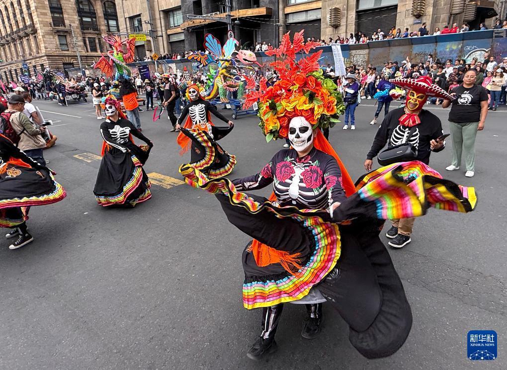 10月18日,在墨西哥首都墨西哥城,身著亡靈節服飾的舞者參加魔幻動物大游行(手機照片)。 當日,為迎接即將到來的亡靈節,墨西哥城舉辦魔幻動物“Alebrijes”大游行。“Alebrijes”是一種墨西哥傳統手工藝品,用鮮艷的顏色和豐富的圖案裝飾,展現充滿想象力的奇幻動物形象。 新華社記者 武巍 攝