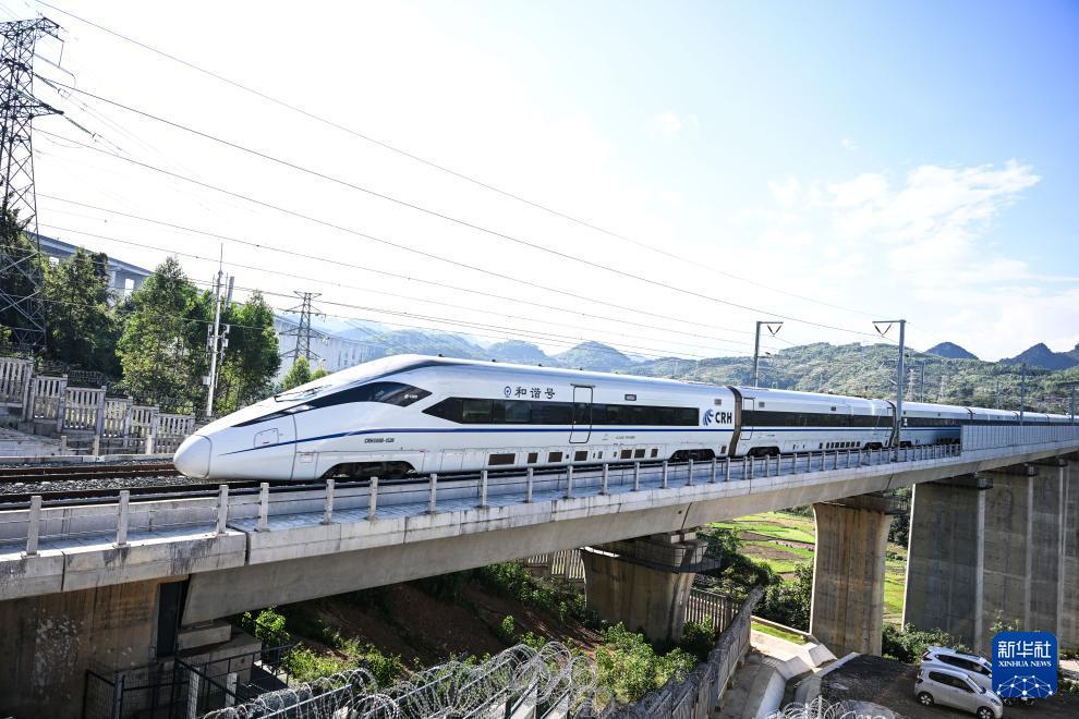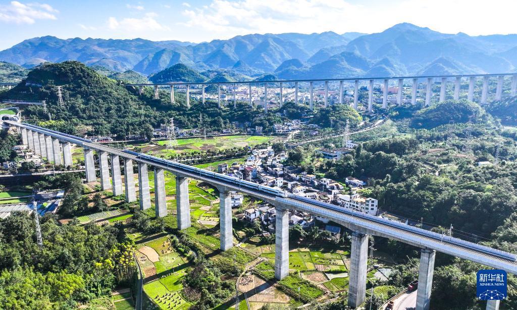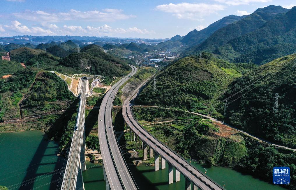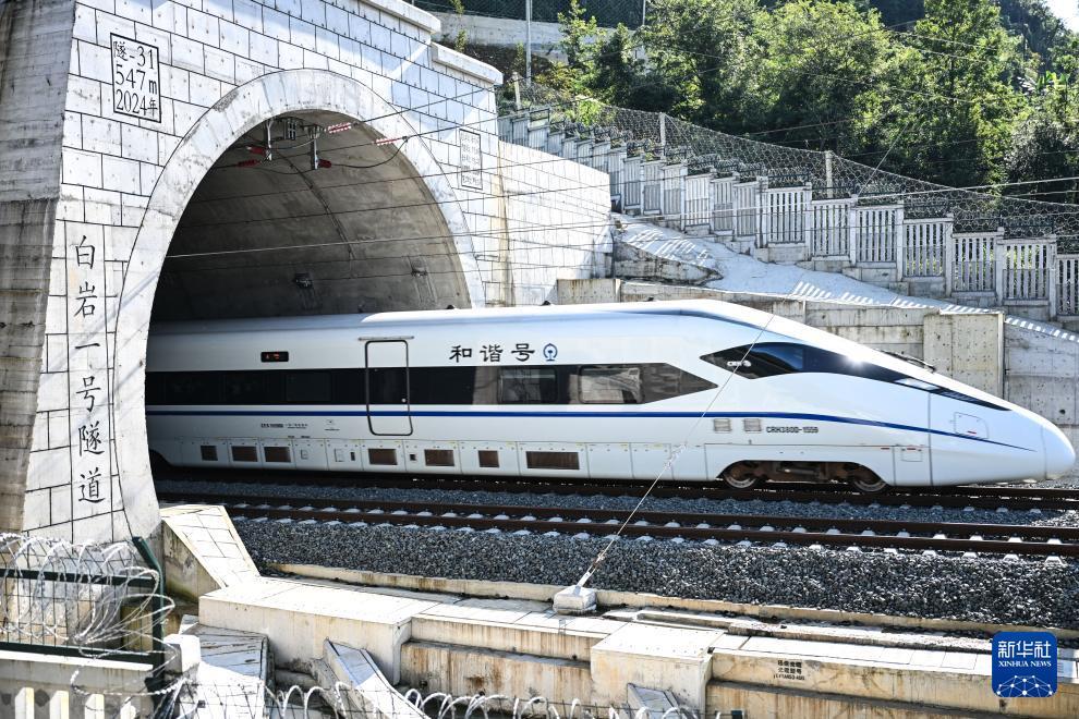 10月17日,運行試驗列車經過貴州盤興高鐵三標段白巖一號隧道(無人機照片)。 目前,新建貴州盤州至興義高速鐵路進入運行試驗階段,線路開通進入倒計時。 盤興高鐵設計時速250公里,正線長度約98公里,全線共設車站3座。盤興高鐵是貴州省實現"市市通高鐵"目標的最后一個項目,項目建成通車后,貴陽至興義2小時可達,對完善區域鐵路網布局,促進當地經濟發展具有重要意義。 新華社記者 楊文斌 攝
